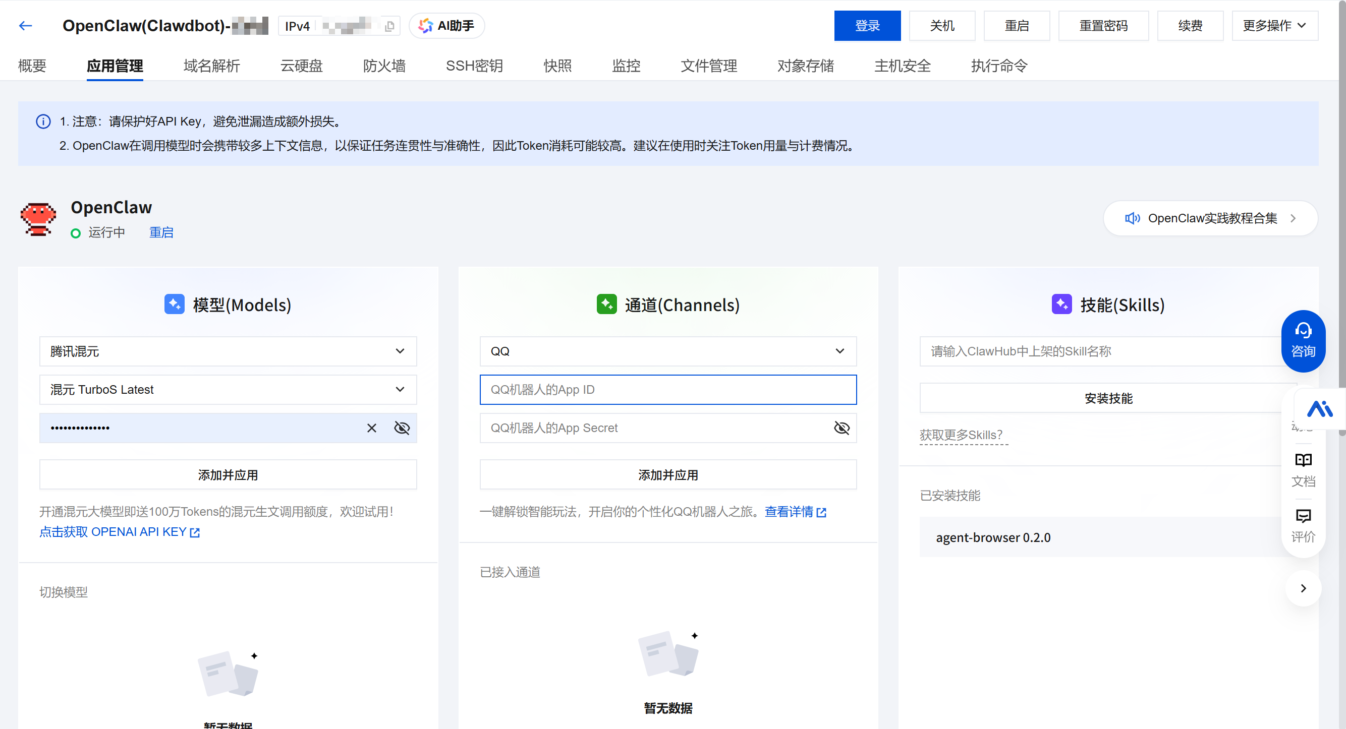 我买的国内的服务器,是因为我准备连国内大模型API(主力是GLM 4.7,也试了试Qwen、混元模型)和国内通讯软件(QQ和飞书机器人。其实还浅研究了一下企业微信,但我企业微信还没有开企业,我是员工不是管理员,所以就放弃了)。如果需要连海外大模型(如ChatGPT、Claude)和IM(如telegram和WhatsApp)就租个海外的服务器,如果海内外都想要就也连海外服务器,但是国内访问会慢)。