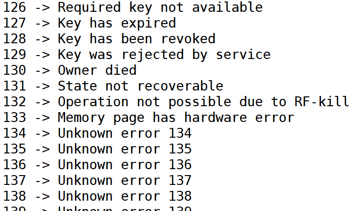 不同的退出码通常有不同的特殊的含义,包括是否正确运行、错误原因等。这个含义通常可以自定义,但是语言提供了一套数字到字符串的转化表。我们打印出来看一下(由于不知道有多少个退出码 所以多打印几个看看),需要用到strerror() 函数。