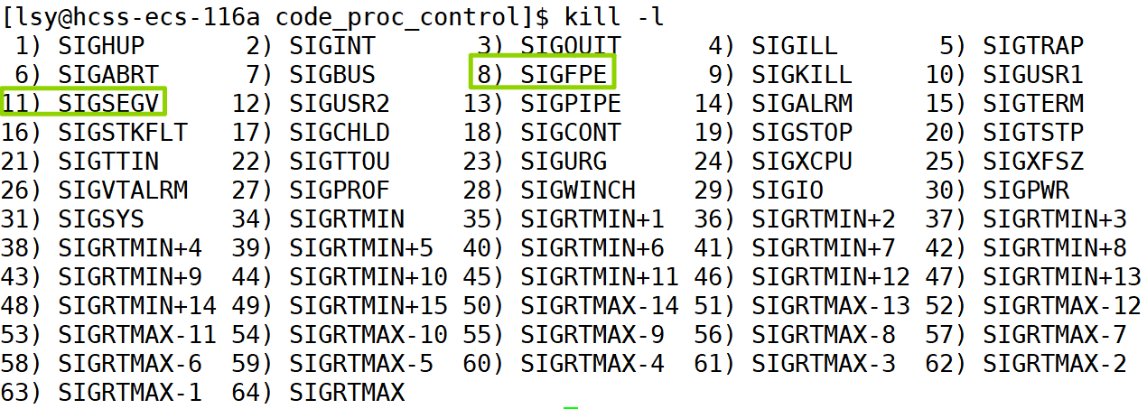 信号编号signumber 是操作系统内核为每一种信号分配的唯一数字标识符。比如8号是除零错误的信号,当程序中出现除零错误,进程就会收到这个信号;11号是野指针信号等等。进程收到这些信号都会终止。