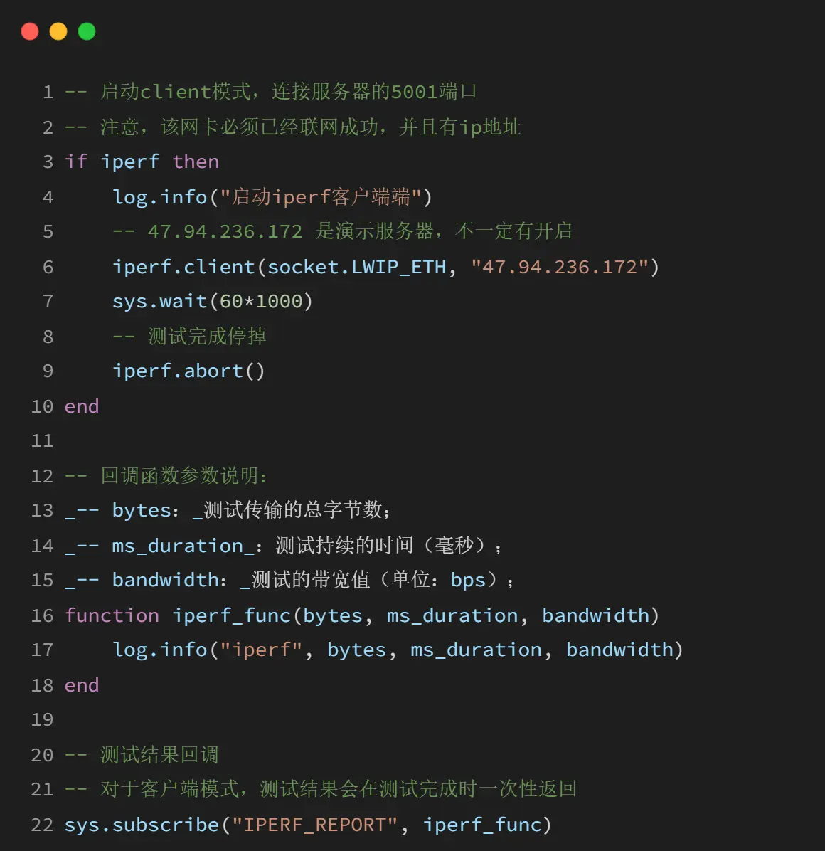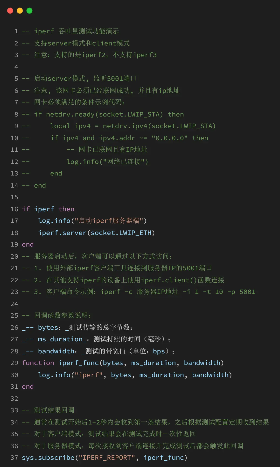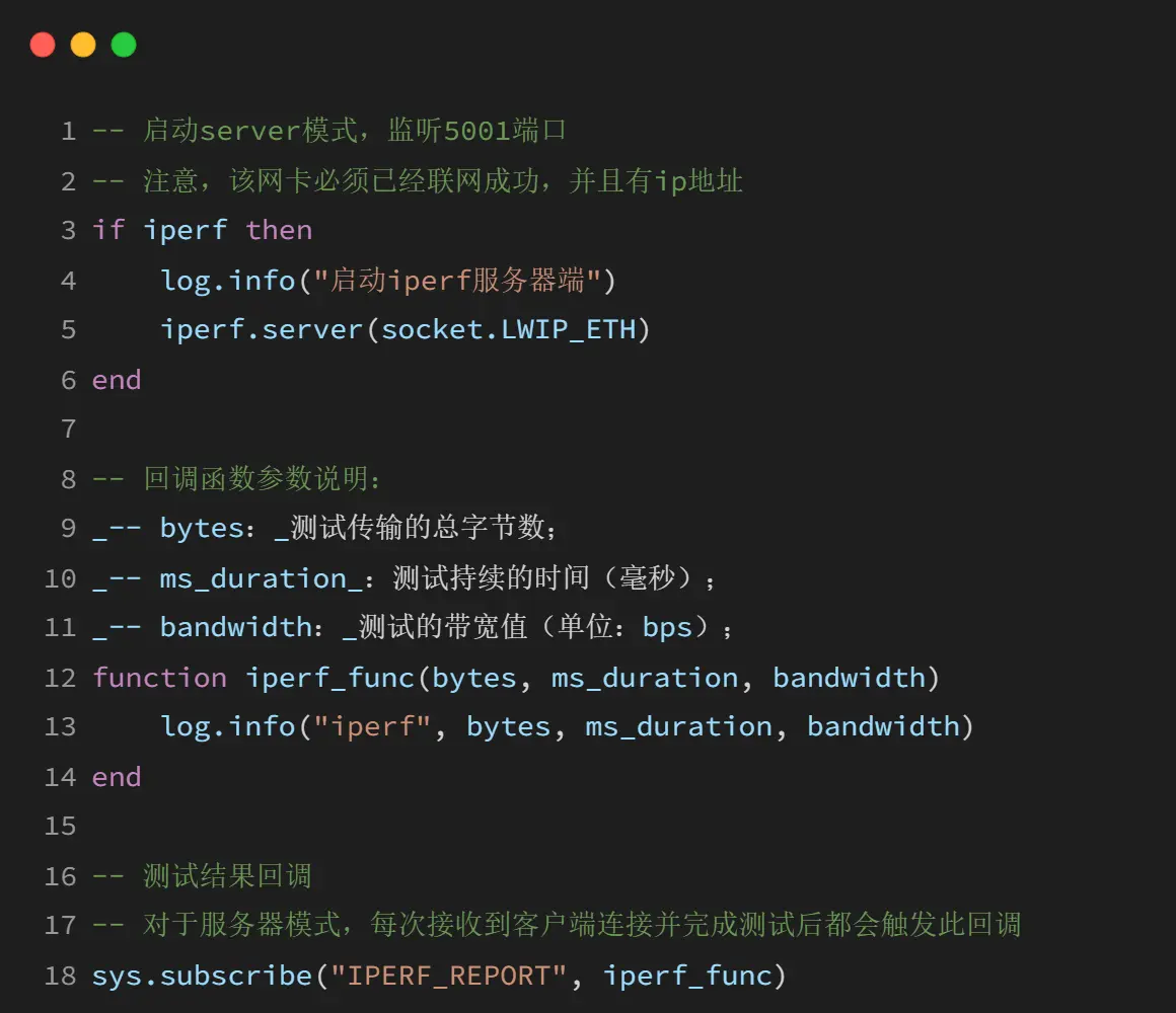 LuatOS 提供的 iperf 库支持 server 模式和 client 模式,但需要注意的是,当前版本支持的是 iperf2 协议,不支持 iperf3 协议。