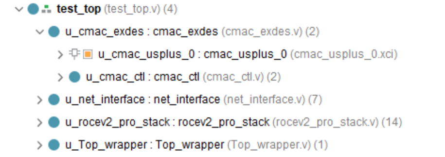 出于精简接口的考虑,并没有将 RoCE v2 高速数据传输系统打包为 IP 后再与 CMAC集成块进行连接,而是直接将 CMAC 包含进 HDL 工程内。 HDL 工程从上至下依次为: CMAC 集成块封装、以太网协议栈、融合以太网协议栈及 Block Design 工程。