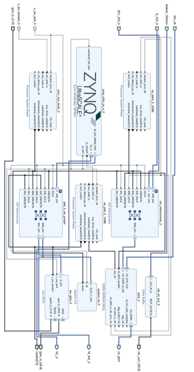 基于 XCZU47DR FPGA 的 Block Design 工程如图 2 所示, Block Design 中包含了 CPU 模块、 DDR 接口模块和外设控制模块。其中 CPU 模块包含 Xilinx ZYNQ 硬核及一些外置的时钟控制和复位模块; DDR 接口模块中使用 MIG 控制器将 DDR 地