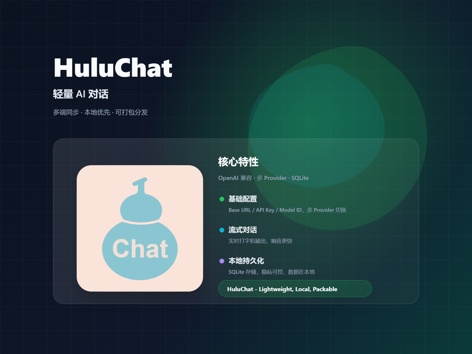 openai,用OpenAI(base_url=..., api_key=...)+chat.completions.create(..., stream=True/False, ...)即可对接任意 OpenAI 兼容 服务;第二节已展开各参数、消息格式、流式/非流式与错误处理。 - HuluChat 在此基础上做了多 Provider、流式对话、本地 SQLite、桌面 UI 和