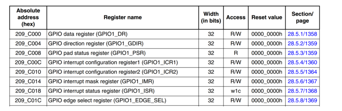 reg 属性设置了 GPIO1 控制器的寄存器基地址为 0X0209C000,从I.MX6ULL 参考手册中可以看到GPIO1 控制器的基地址就是 0X0209C000,如下图所示: