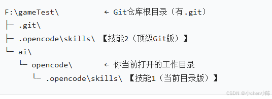 opencode\.opencode\skills\→ 找到,且发现opencode\有.git(Git 根目录); - Step4:停止查找(不会再往上找