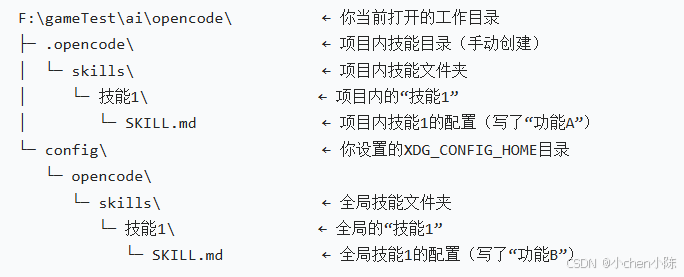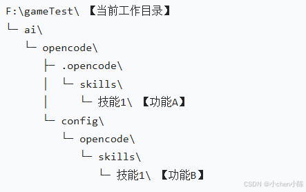 注意:如果在 F:\gameTest\ai\opencode\.opencode\skills\(项目内)和 F:\gameTest\ai\opencode\config\opencode\skills\(全局)都放了「技能 1」时,项目内的技能 1 会覆盖全局的技能 1------OpenCode 会优先用项目内的版本,全局的版本会被 "屏蔽",只有删掉项目内的技能 1,才会用到全局的