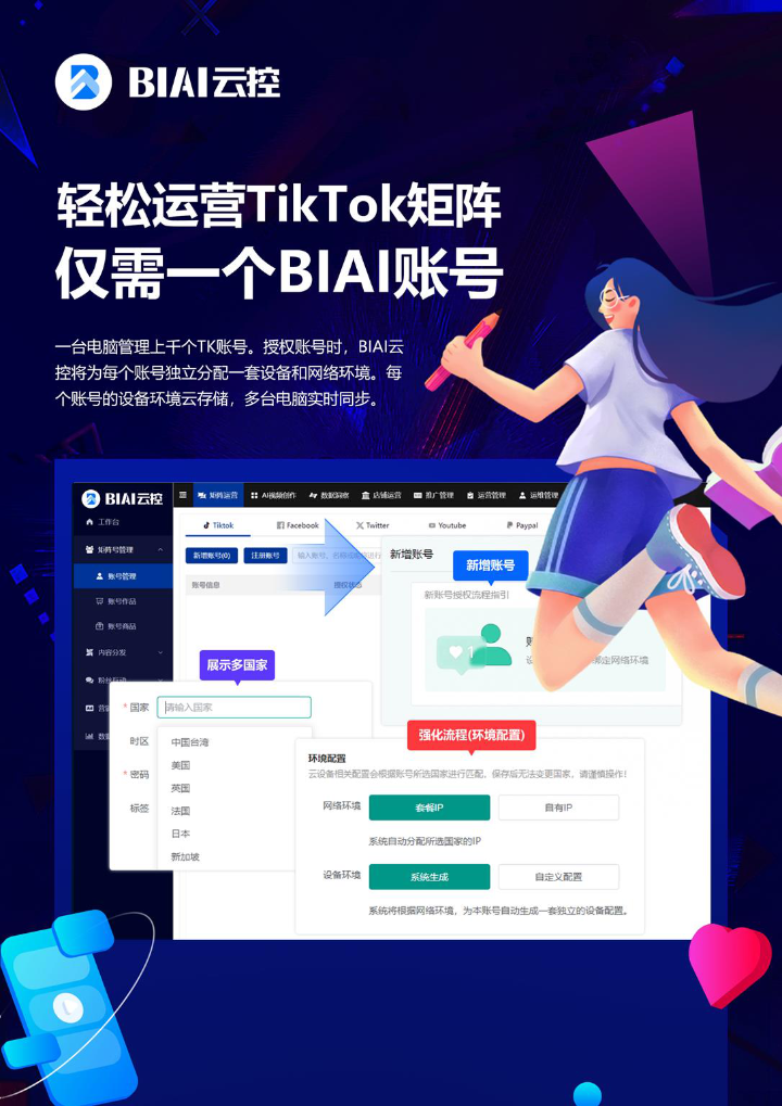 TikTok矩阵引流的本质是"规模化+精准化"的结合,而专业工具是破局效率与成本矛盾的核心。BIAI云控系统作为深耕社媒电商营销5年的自研工具,把矩阵运营、AI内容生产、账号安全、数据优化融为一体,让中小团队也能以低成本撬动TikTok全球流量池,实现规模化精准引流。