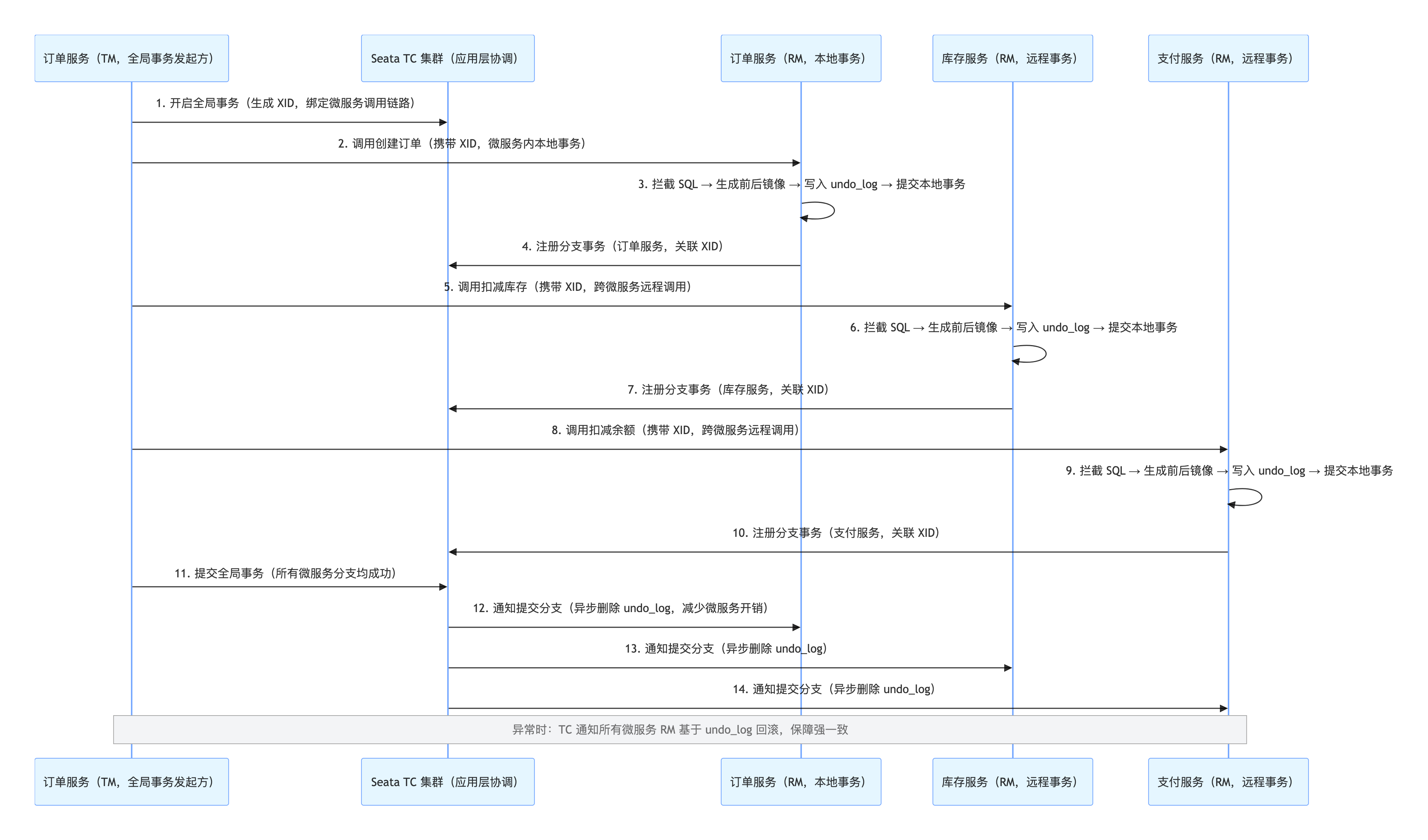业务特征 :跨 3 个微服务(订单服务、库存服务、支付服务)、跨 MySQL 实例、一致性要求 100%、QPS 约 1000,属于微服务核心交易链路。