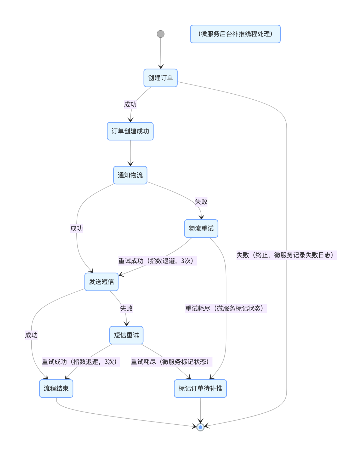 - 通知类环节只重试、不回滚:物流、短信属于微服务辅助流程,失败后仅执行重试(3~5 次,指数退避),重试耗尽后标记状态、进入待补推,不影响主流程;