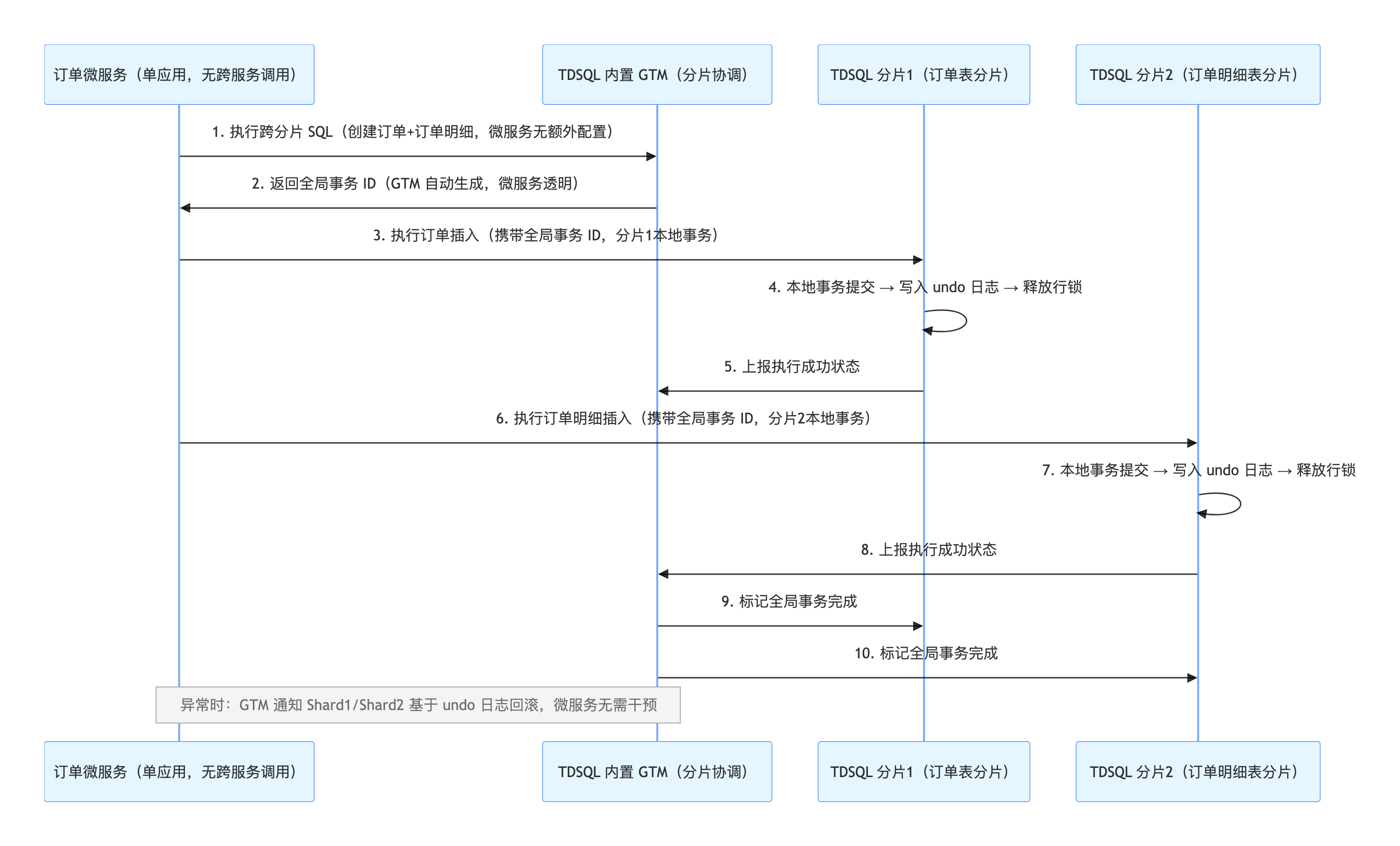 业务特征 :无跨微服务(仅单订单微服务)、同一个 TDSQL 集群 / 同一个逻辑库内、QPS 超 5000、一致性要求 100%、追求低运维成本,属于微服务单应用跨分片核心场景。TDSQL 事务时序图 :