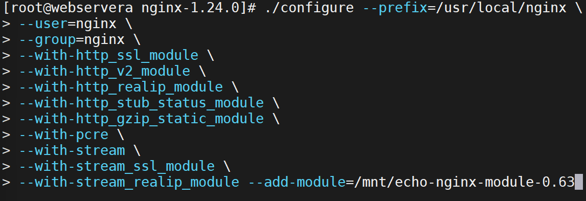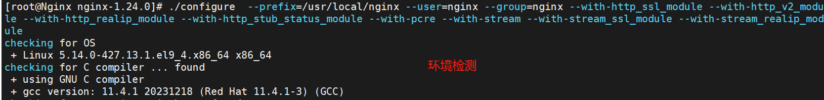 [root@Nginx nginx-1.26.1]# ./configure --with-http_ssl_module --withhttp_v2_module --with-http_realip_module --with-http_stub_status_module --withhttp_gzip_static_module --with-pcre --with-stream --with-stream_ssl_module --
