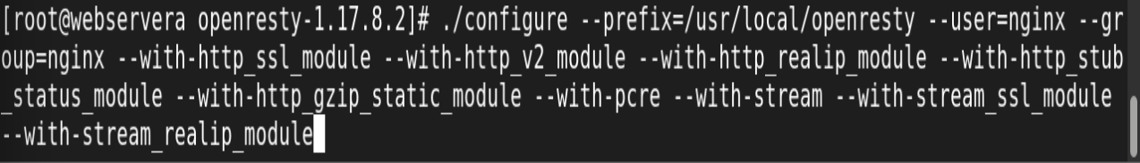 ./configure --prefix=/usr/local/openresty --user=nginx --group=nginx --with-http_ssl_module --with-http_v2_module --with-http_realip_module --with-http_stub_status_module --with-http_gzip_static_module --with-pcre --with-stream --with-stream_ssl_module --with-stream_realip_module