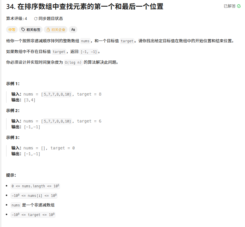 给定非递减排序的整数数组 nums 和目标值 target,需找到 target 在数组中的第一个位置 和最后一个位置 ;若不存在则返回 [-1, -1],要求时间复杂度为 O(log n)。