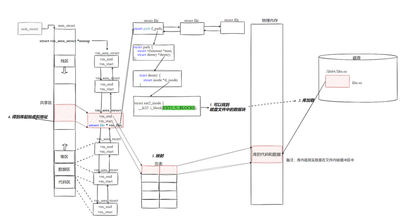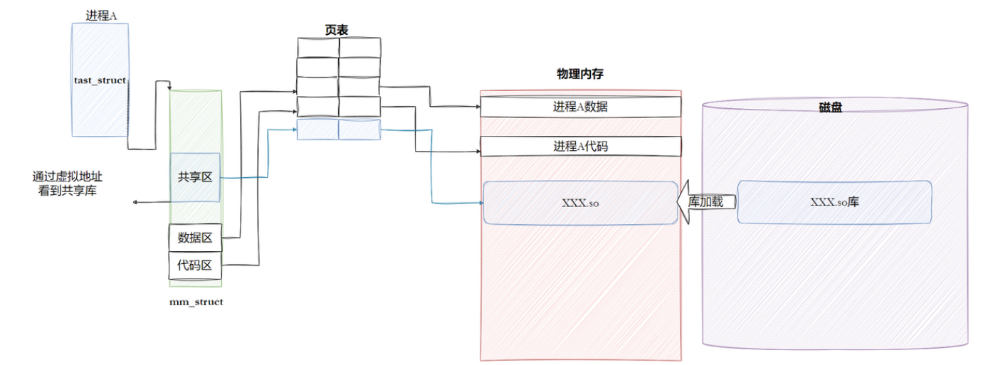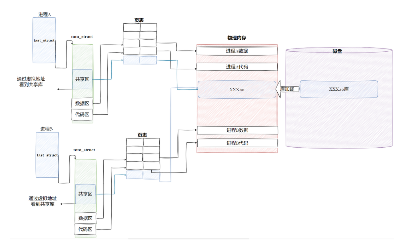 mm_struct中创建一个共享区 的vm_area_struct,并通过页表将该共享区的虚拟地址映射到物理内存中共享库的位置。 - 地址透明:进程 A 通过虚拟地址访问共享库,对其而言,共享库就像自己地址空间的一部分,但实际物理内存只存在一份,实现了代码共享