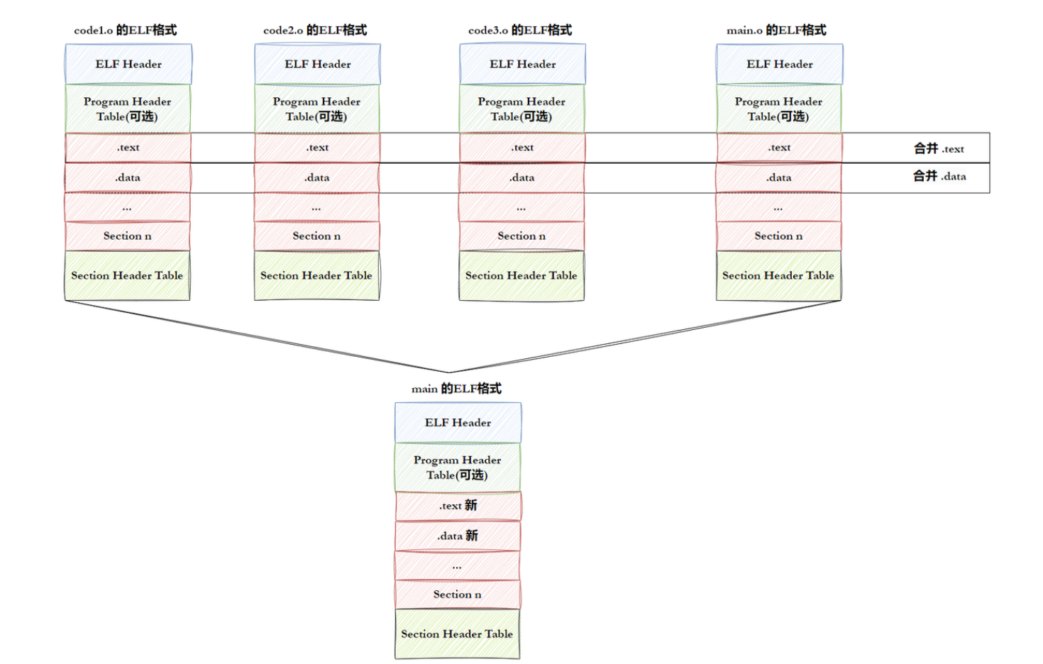 code.o中e8 00 00 00 00 callq 14:e8是 call 指令,后面的 4 个 0 表示 "调用的函数地址暂时未知",只是占位。hello.o中同样有e8 00 00 00 00 callq:同理,调用的函数地址还没被解析
