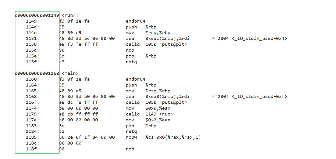 可以看到这里的call指令,它们分别对应之前调用的printf和run函数,但是你会发现他们的跳转地 址都被设成了0。那这是为什么呢?
