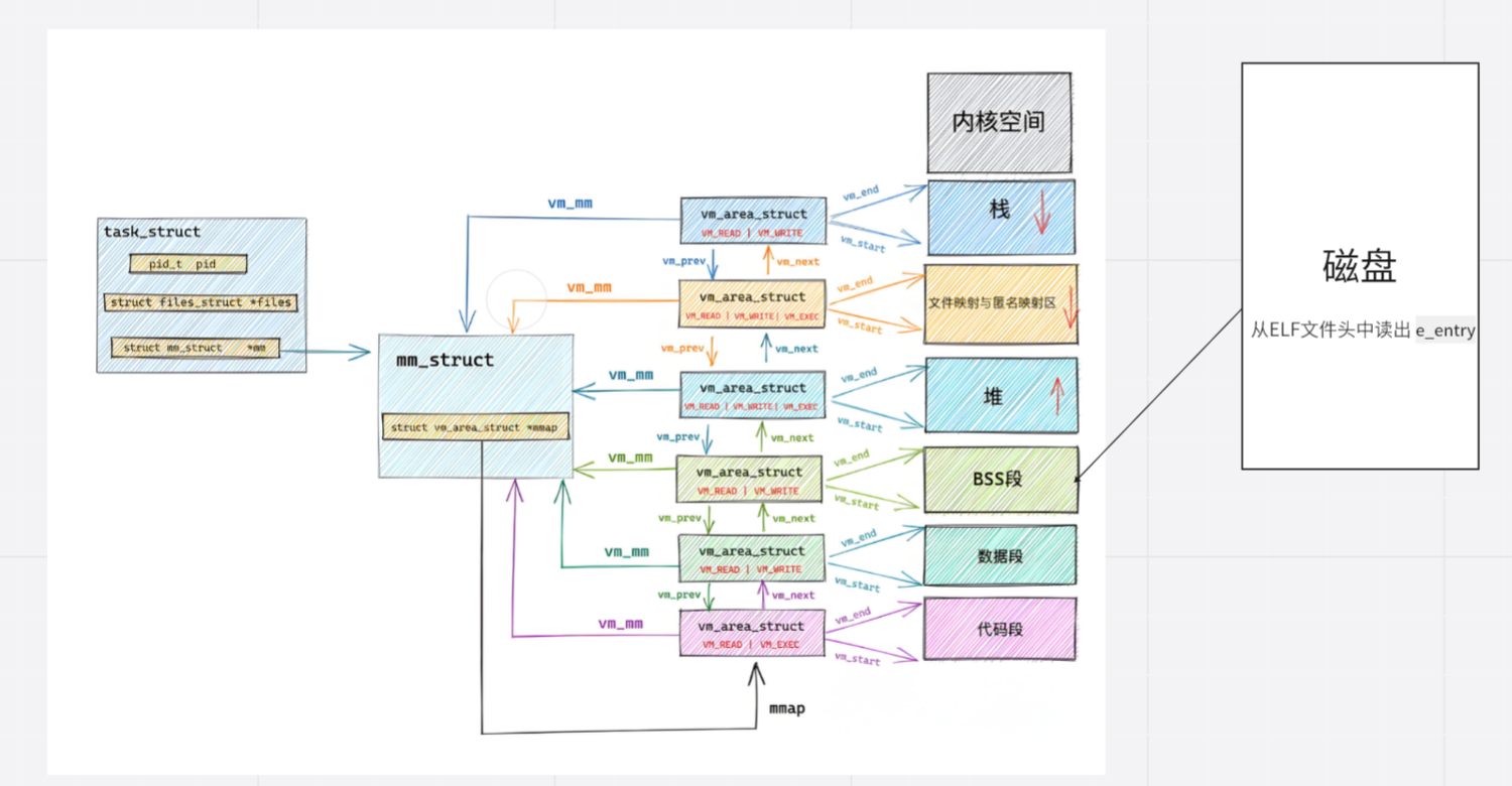 一句话总结:内核从 ELF 中读取入口地址,通过 mm_struct 构建虚拟地址空间,再将入口地址写入指令指针寄存器,CPU 便从该地址开始执行