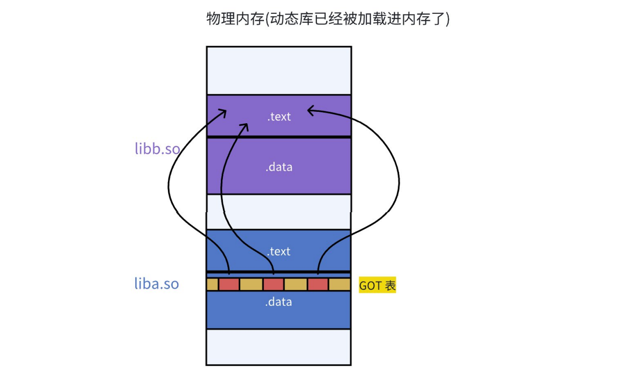 总结:物理内存里只有一份动态库的代码段,每个进程并不会 "重新加载" 这份代码,而是把自己虚拟地址空间里的一段地址,通过页表映射到这份共享的物理内存上;GOT 里的 "指针",指向就是当前进程这段共享物理内存的 "虚拟地址"