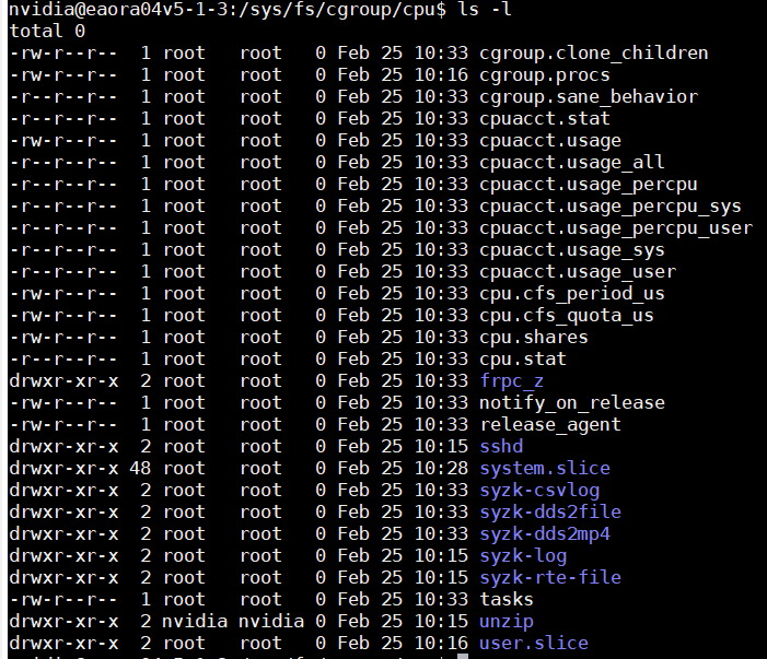 system.slice:系统服务(如sshd),权限为root。user.slice:用户会话,截图中出现了unzip子目录,权限为nvidia:nvidia,说明当前有用户正在执行解压操作,且被 systemd 自动纳入了资源管理。