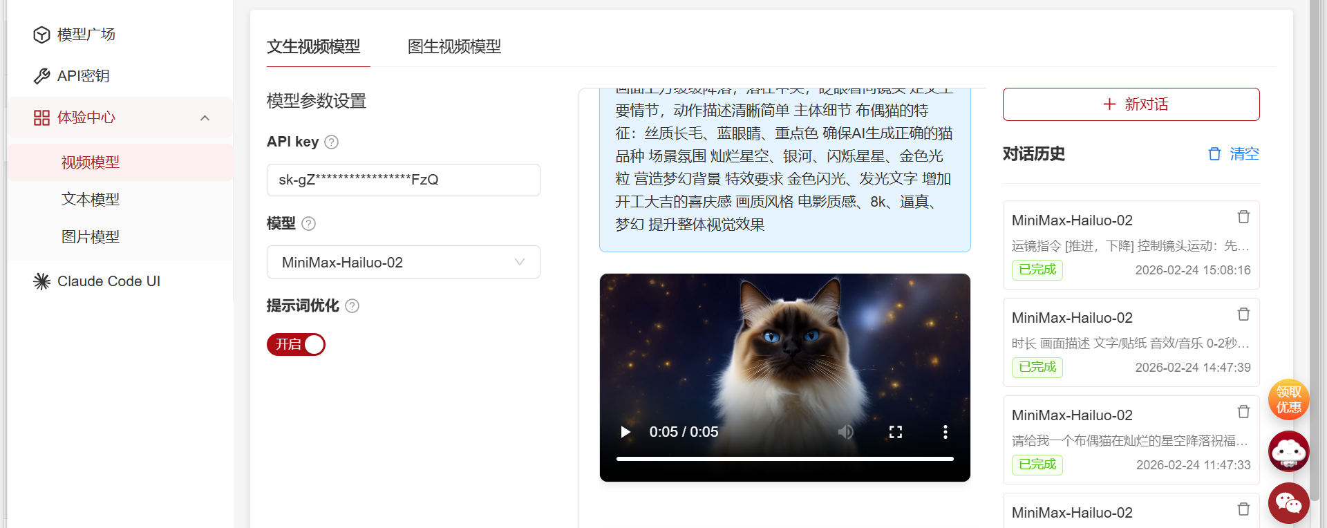 请先欣赏一下,这个是MiniMax-Hailuo-02生成的视频,提示词比较简单,如图所示:请给我生成一个布偶猫在灿烂星空降落祝福开工大吉的视频。