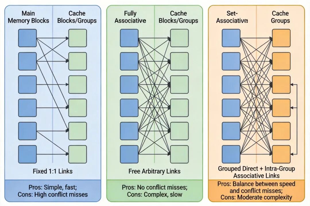 组相联映像 :为直接映像与全相联映像的折中方案,将 Cache 划分为若干组,主存块与 Cache 组采用直接映像,组内采用全相联映像。该方案在访问速度、空间利用率、实现成本之间取得最优平衡,是当前主流 CPU 采用的映射方式