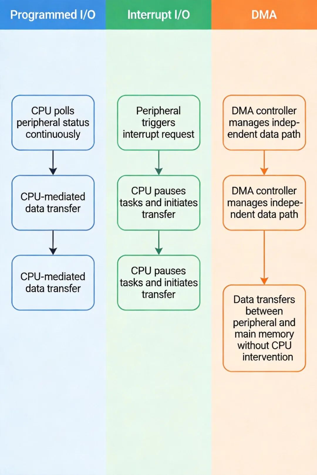 DMA(直接存储器访问)方式:在外设与主存之间建立独立数据通路,数据传输过程由 DMA 控制器全权负责,无需 CPU 介入,可实现大量数据的高速传输,是当前高速存储设备的主流控制方式