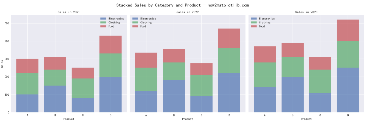 fig.suptitle('Stacked Sales by Category and Product - how2matplotlib.com', fontsize=16)