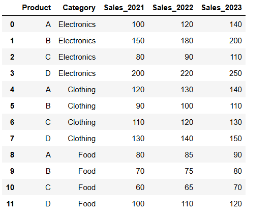 categories = df['Category'].unique() # ['Electronics', 'Clothing', 'Food']