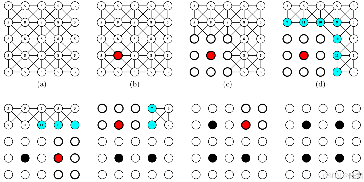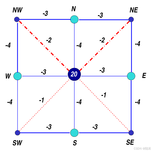 在上图中, F i s F_i^s Fis = { N W , N E } \{NW,NE\} {NW,NE},对于 N W NW NW,连接的粗点是 { N , W } \{N,W\} {N,W},那么 δ N W = − 3 − 4 = − 7 \delta_{NW} = -3-4=-7 δNW=−3−4=−7,同理 δ N E = − 3 − 4 = − 7 \delta_{NE} = -3-4=-7 δNE=−3−4=−7。