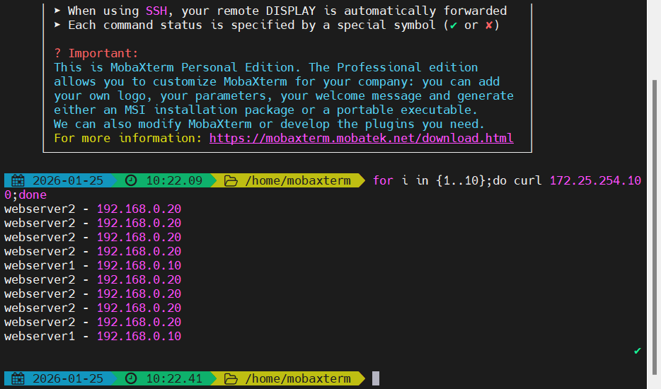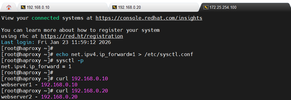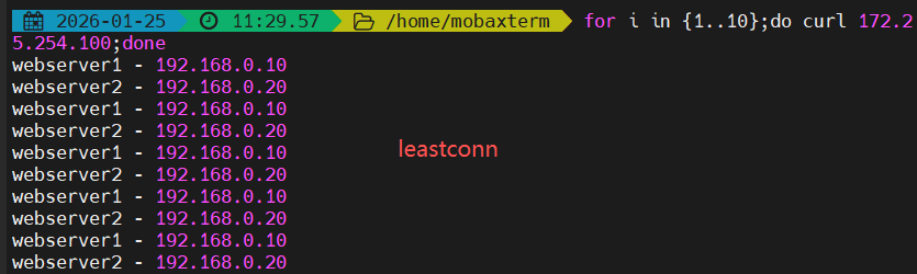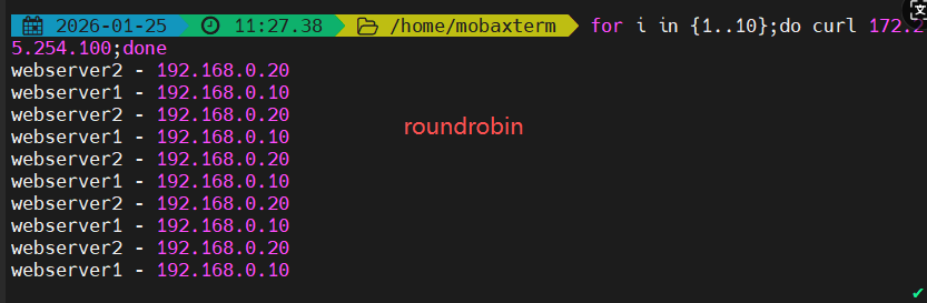 验证效果:通过curl 172.25.254.100测试,请求会轮询分发到 web1 和 web2,返回不同节点的标识信息。
