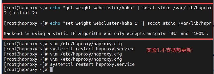# 格式:echo "set weight 后端集群名/节点名 新权重" | socat stdio /var/lib/haproxy/stats