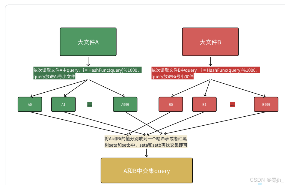 - 本质是相同的query在哈希切分过程中,一定进入的同一个小文件Ai和Bi,不可能出现A中的的 query进入Ai,但是B中的相同query进入了和Bj的情况,所以对Ai和Bi进行求交集即可,不需要Ai 和Bj求交集。(本段表述中i和j是不同的整数)