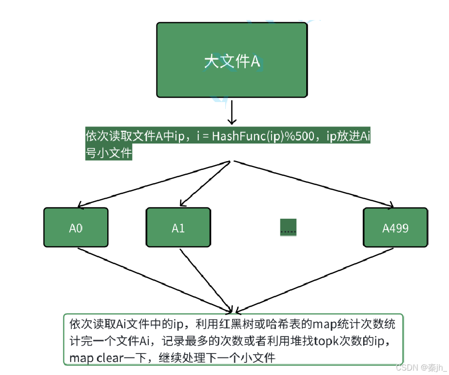 本题的思路跟上题完全类似,依次读取文件A中query,i = HashFunc(query)%500,query放进Ai号小 文件,然后依次用map对每个Ai小文件统计ip次数,同时求出现次数最多的ip或者topk ip。本质是相同的ip在哈希切分过程中,一定进入的同一个小文件Ai,不可能出现同一个ip进入Ai和Aj 的情况,所以对Ai进行统计次数就是准确的ip次数