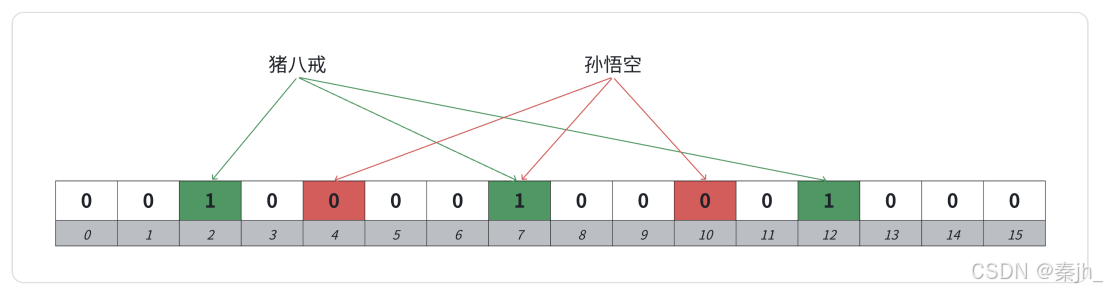 解题思路3:数据是否在给定的整形数据中,结果是在或者不在,刚好是两种状态,那么可以使用一个 二进制比特位来代表数据是否存在的信息,如果二进制比特位为1,代表存在,为0代表不存在。那么 我们设计一个用位表示数据是否存在的数据结构,这个数据结构就叫位图。