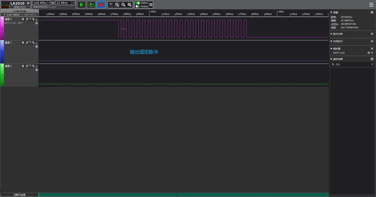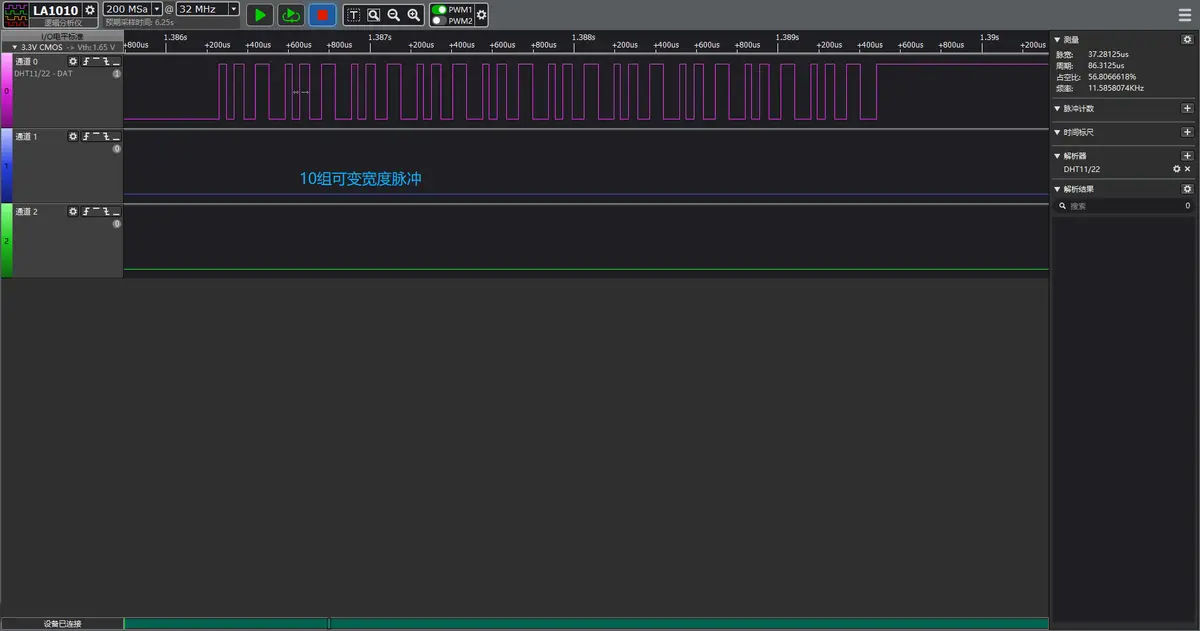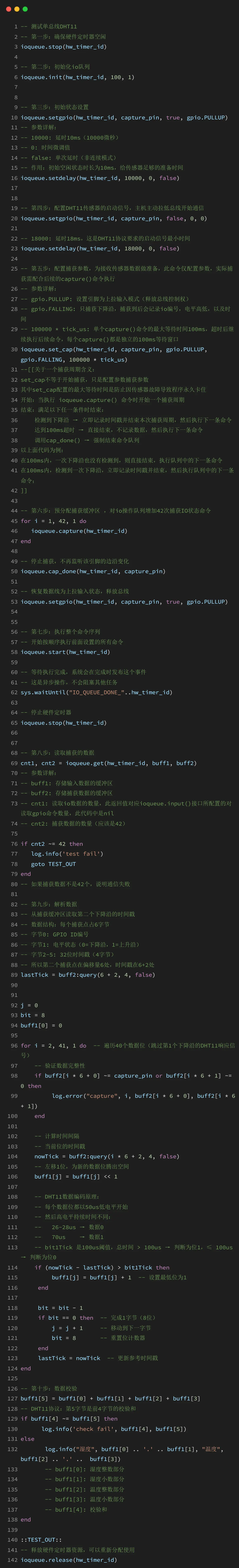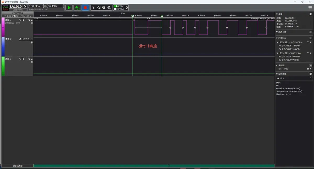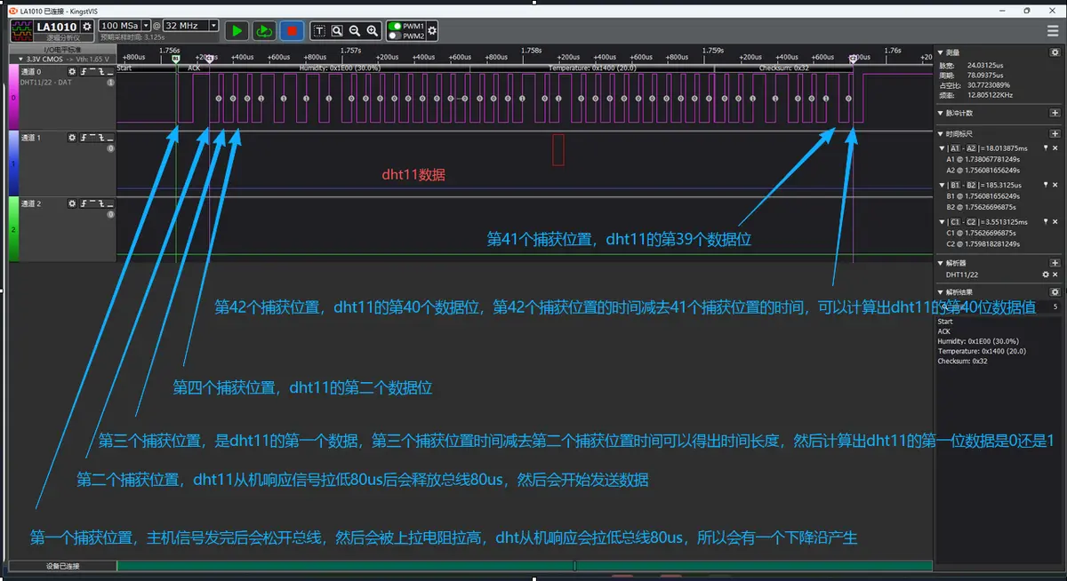 下面演示使用硬件定时器精确控制 DHT11 通信时序,通过捕获下降沿时间戳解码温湿度数据,实现微秒级精确通信: