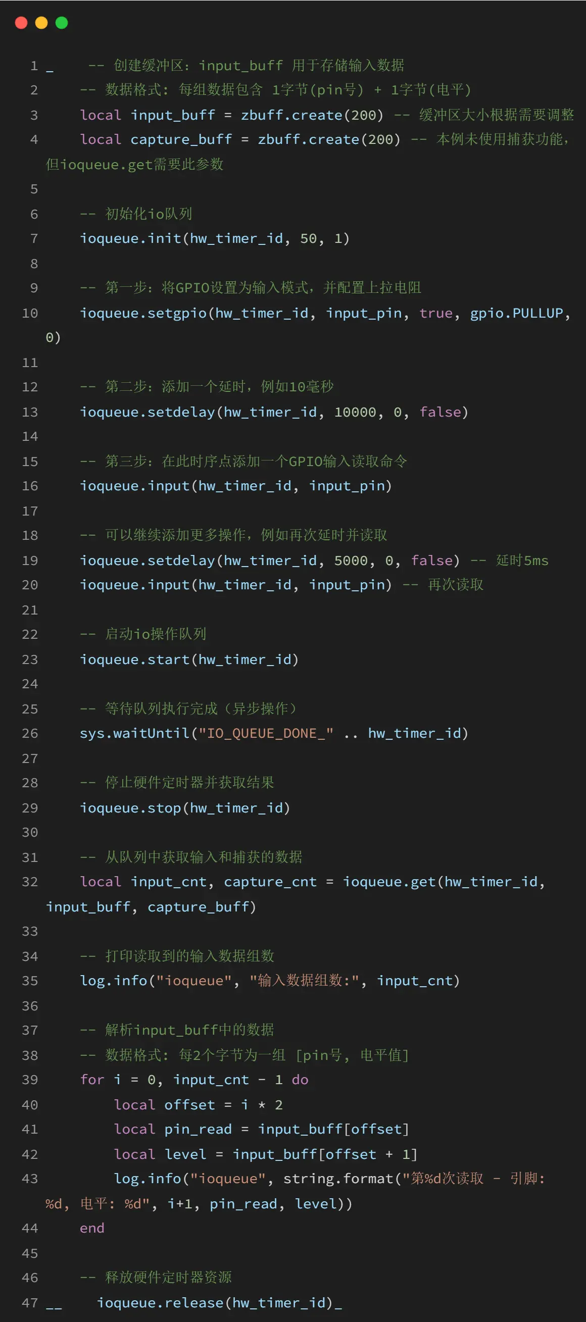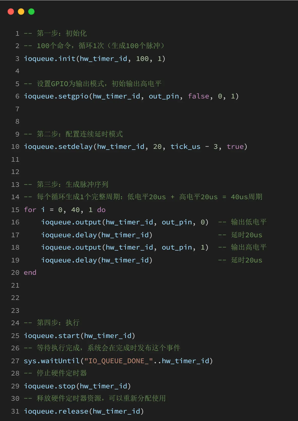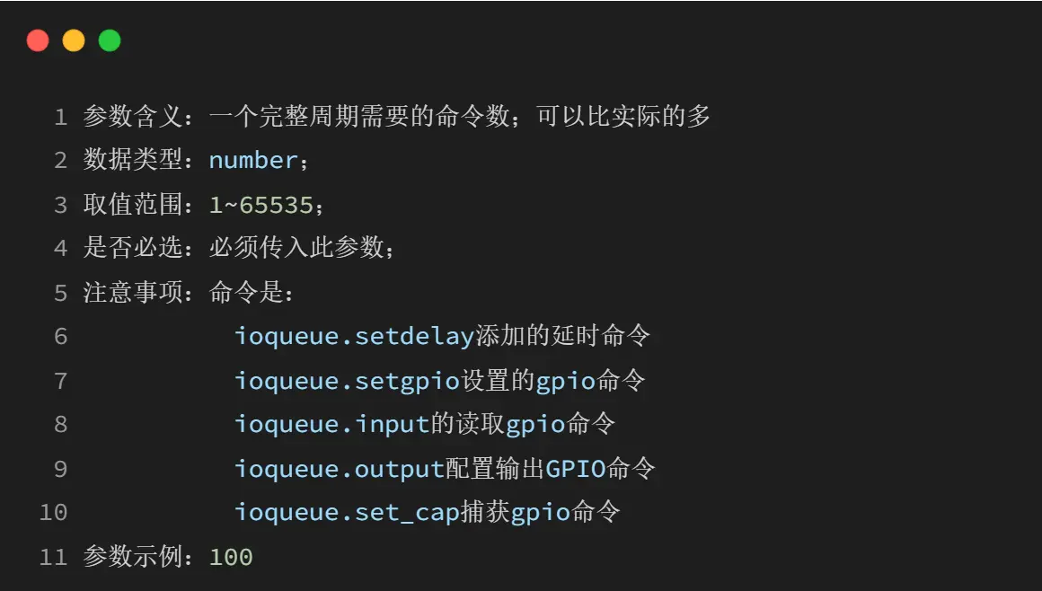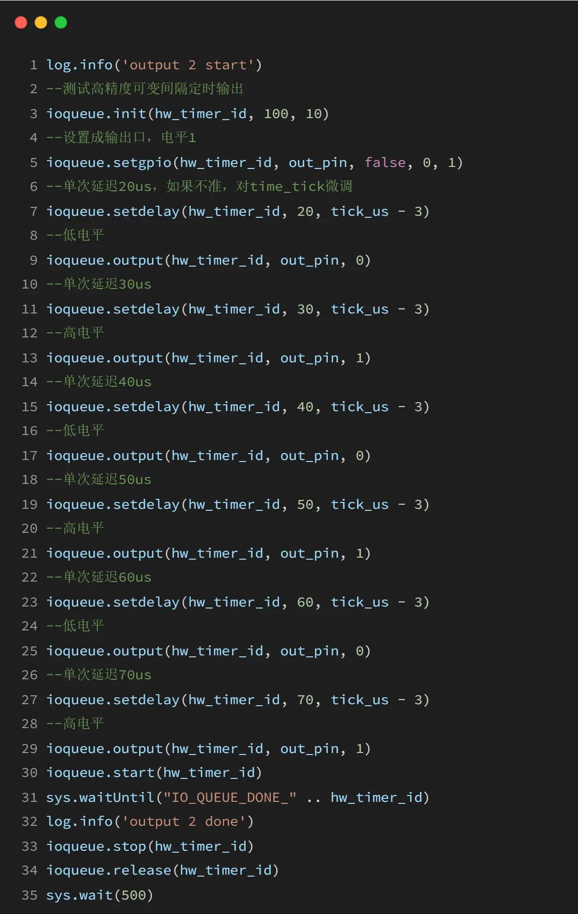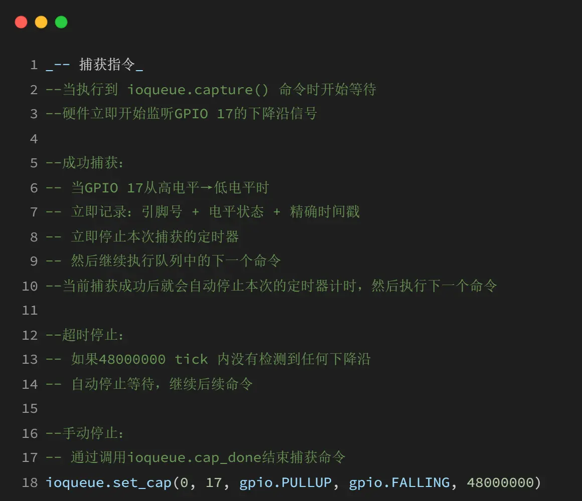 ioqueue 模块提供了 IO 序列操作的功能,可以通过硬件定时器精确控制 GPIO 的操作时序。