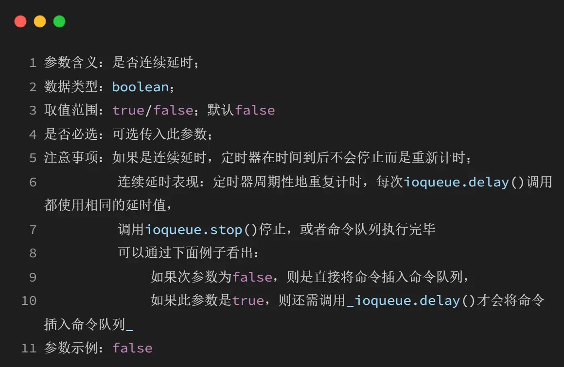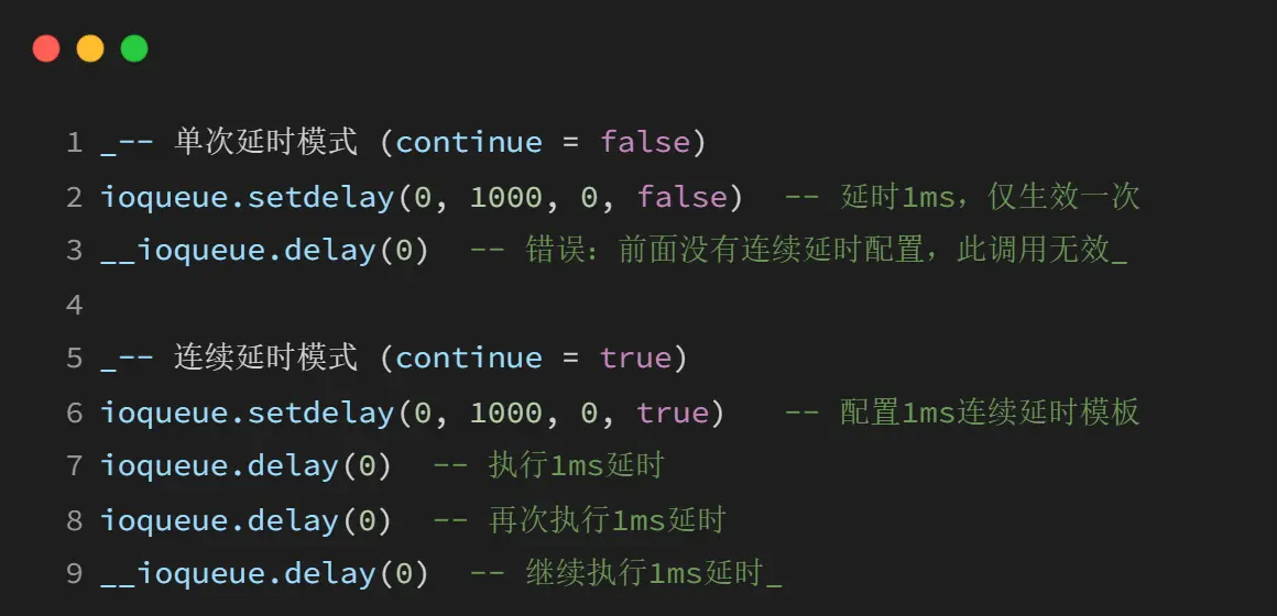 必须在前面的 ioqueue.setdelay 设置 continue=true