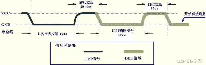 起始信号 :总线空闲状态 由 DHT11 内置上拉电阻拉高 ,主机拉低 总线至少 18ms 后释放 总线 20-40us