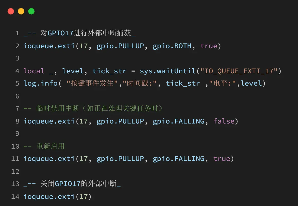 ioqueue.exti 是一个独立的外部中断接口,与 ioqueue 队列系统完全分离,提供简单的 GPIO 边沿事件捕获功能。
