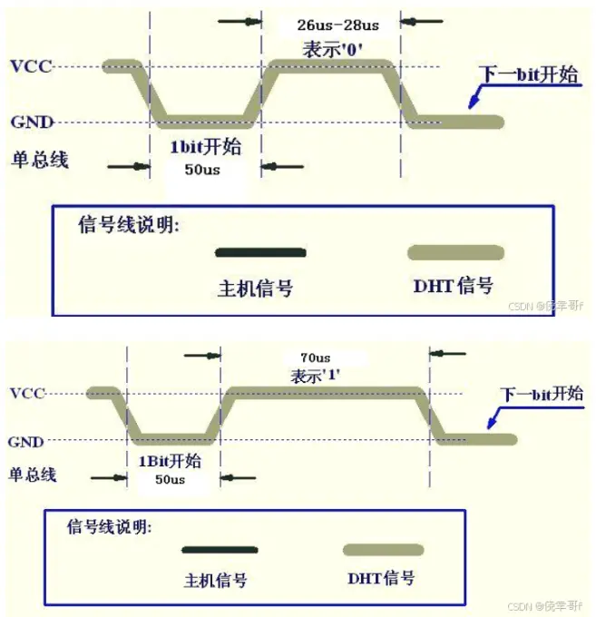 发送数据 :当总线是低电平 是表示开始发送数据,同时存在 50us 低电平时隙 ,之后拉高 总线,高电平的持续时间 表示发送 0 或者 1,当高电平持续时间为 26us-28us 表示发送 0 ,高电平持续时间为 70us 时,表示发送 1