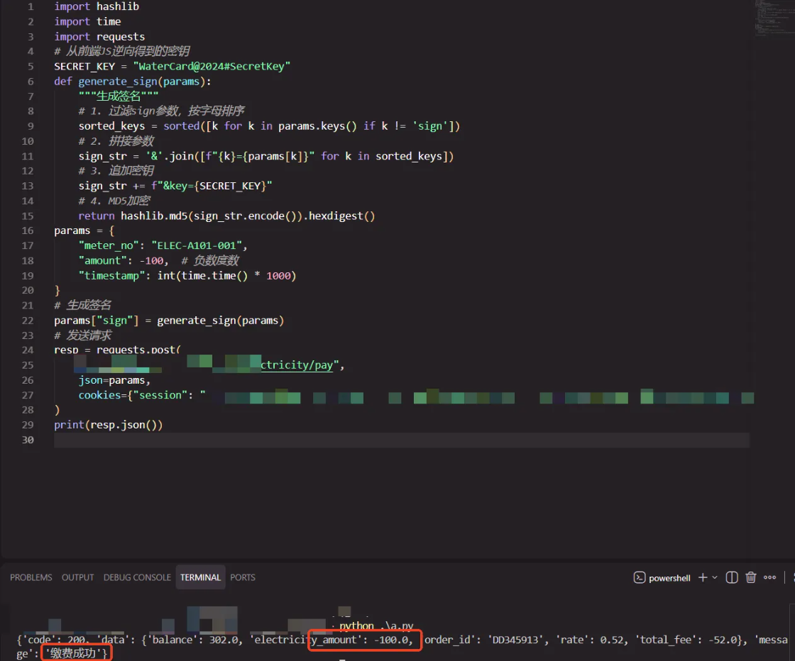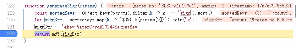 直接全局搜索sign参数,触发充值事件,断点断住了,明文就是amount加上meter_no和时间戳放到generateSign函数进行了加密。