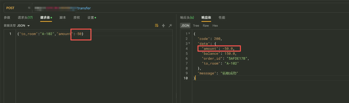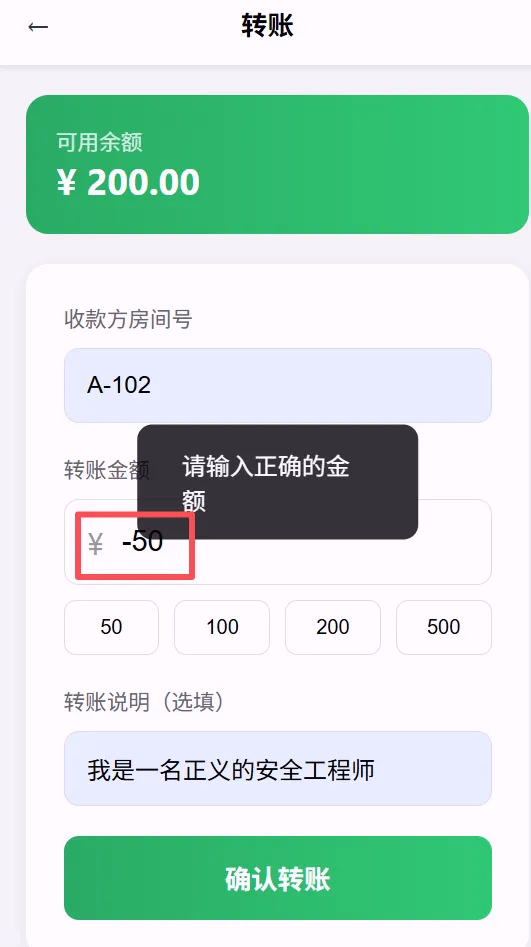直接将amount改为 -50,充值成功!这是典型的负数金额漏洞------后端未校验金额正负,导致 balance + (-50) 使余额反减。既然充值接口没有校验金额正负,那么转账接口大概率也存在同样的问题