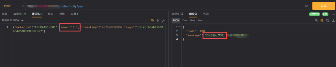 充电的接口与充值、转账接口不同,电费缴纳接口增加了安全防护------请求中包含 sign 签名参数:直接修改 amount 为 -100 后发送,返回"签名验证失败"。这是一种常见的防篡改机制,后端会根据参数重新计算签名并与请求中的 sign 比对。要绕过签名校验,需要逆向分析签名算法。由于这是混合APP,签名逻辑在前端JS中实现,我们可以直接分析。