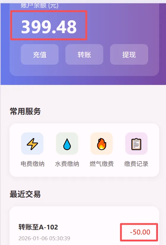 虽然页面展示的我转账至A-102是-50,但是我的余额没扣反加,余额从349.48变成了399.48。原理很简单: