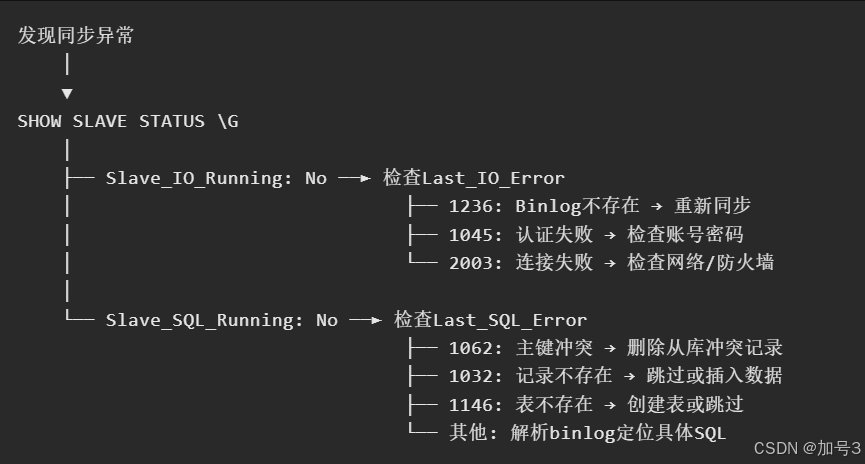 - 主从库数据不一致:比如主库已存在表,从库无此表,导致同步SQL执行失败。解决:停止从库同步(STOP SLAVE;),手动在从库补全缺失的数据/表结构,然后重新启动同步(START SLAVE;)。