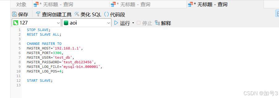 注意:若之前配置过主从,需先执行STOP SLAVE;和RESET SLAVE ALL;清除原有配置,再执行上述CHANGE MASTER TO命令。
