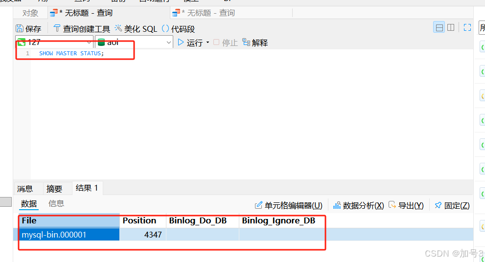 在Navicat输入SHOW MASTER STATUS;如图所示
