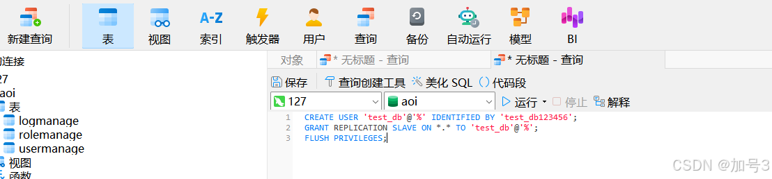 打开Navicat数据库客户端管理软件,如图所示创建同步账号并授权