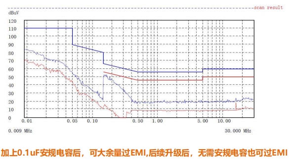 YD925在半波整流+0.1µF电容条件下即可通过EMI测试,无需额外共模电感,进一步压缩成本和体积。
