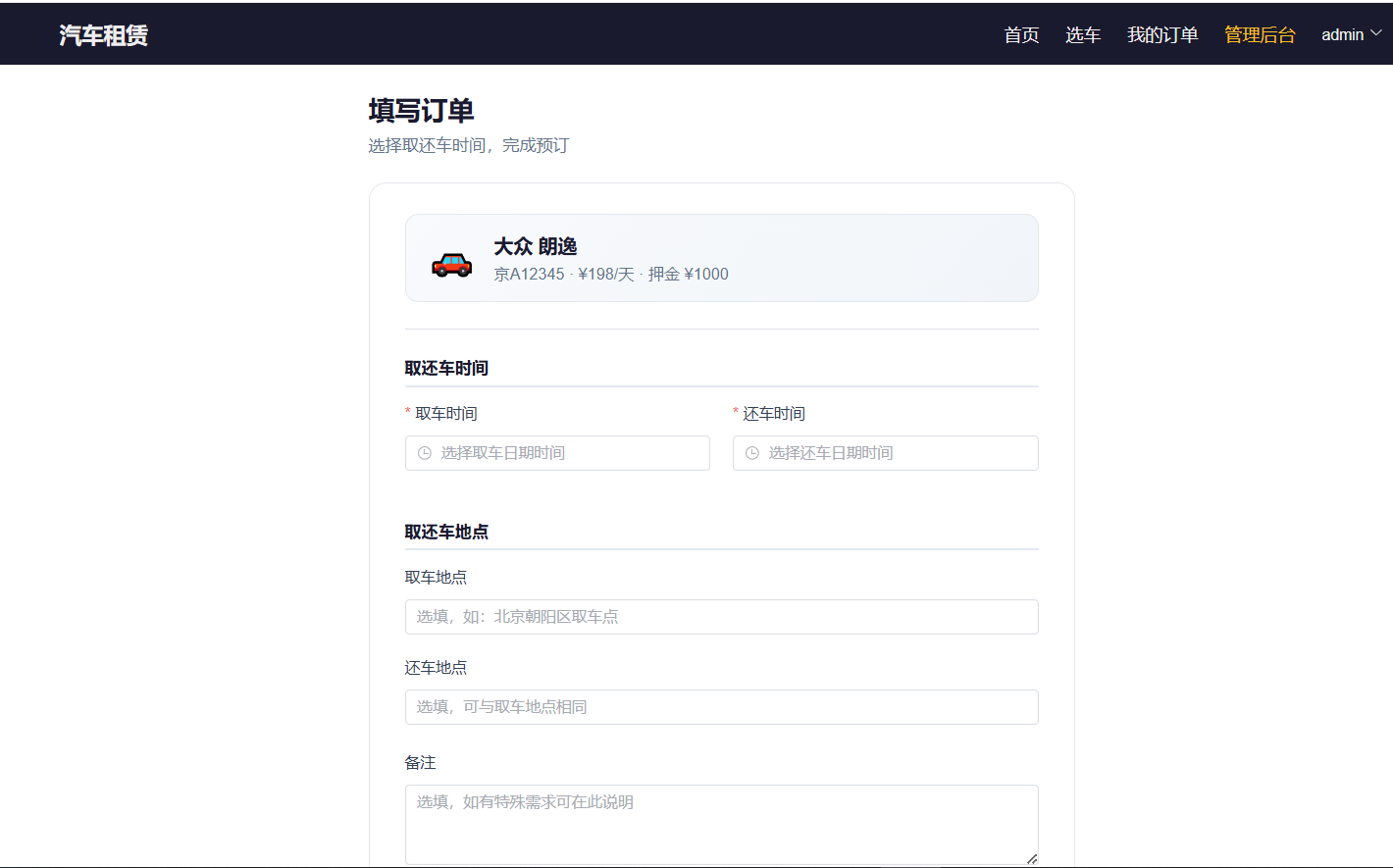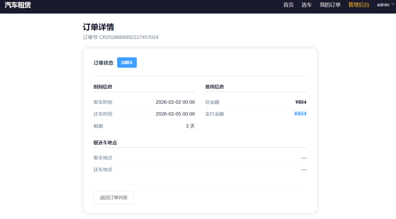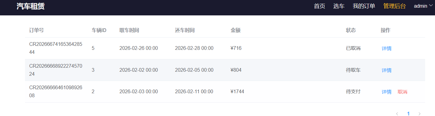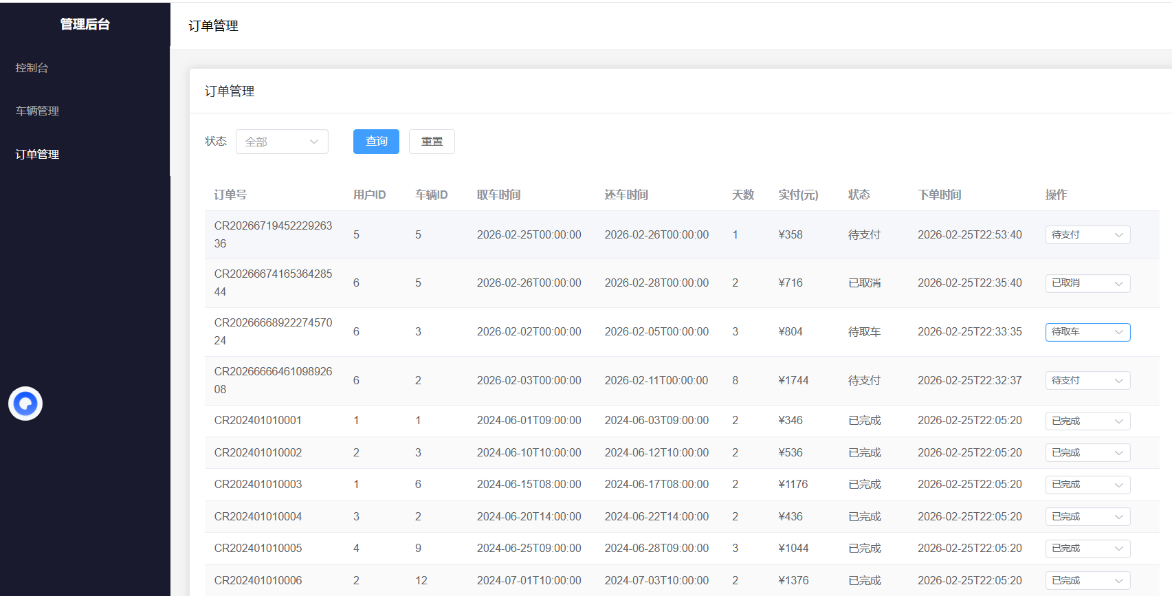 | 订单管理 | 全部订单列表(按状态筛选),管理员修改订单状态(待支付 / 待取车 / 进行中 / 待还车 / 已完成 / 已取消 / 异常) |